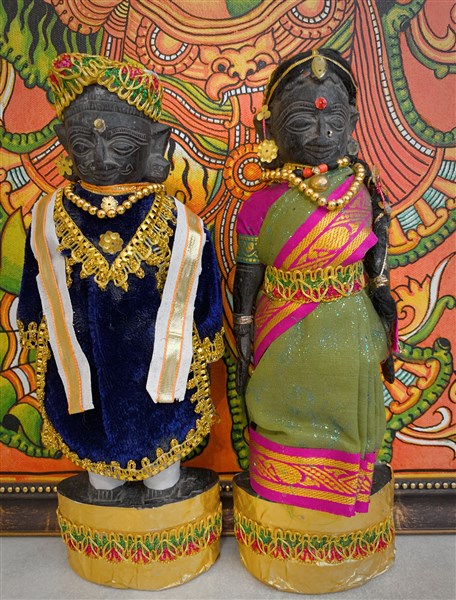 In Karnataka, the state where my parents were born, a pair of wooden dolls called Marapachi or Pattada Gombe (translates to royal dolls) are handed down from mother to daughter over several generations. These crudely carved male and female dolls are decked up in either paper or fabric finery and displayed proudly as the centerpiece of a doll display called Golu during the Navarathri celebrations. My mother passed on her pattada gombes to me several years back. These belonged to my grandmother (and possibly to her mother). It is hard to trace back beyond grandmother’s time since no one remembers.