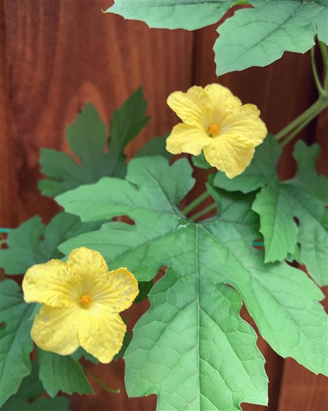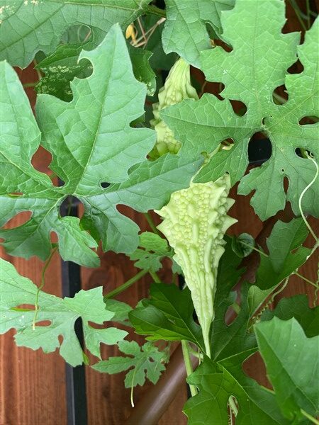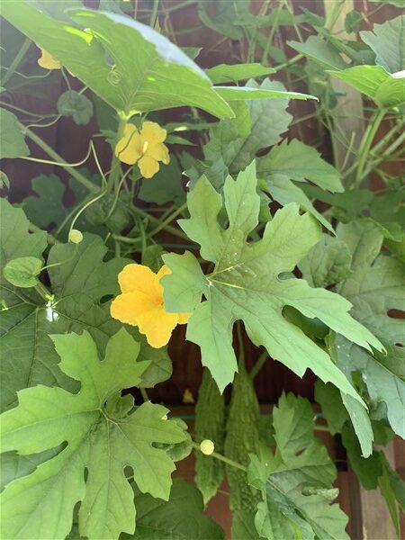 The bitter gourd leaves are probably pre-programmed with DNA that is unsavory to most bugs. So they are pretty much left alone. Within a few weeks, the vines spread their tendrils on the fence and put out these lovely yellow blossoms. I have a great time peering behind each flower to identify which are male and which are female. A tip: the females have a tiny fruit under their blossom. Another tip: the male blossoms arrive before their lady loves.