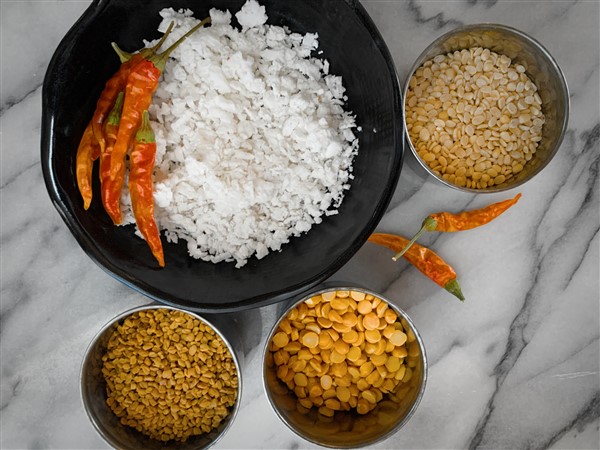 • In the same pan, dry roast chana dal, urad dal, methi (fenugreek) seeds, dry red chili and grated coconut until the lentils and coconut are lightly browned.