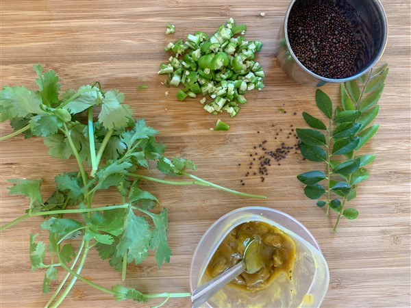 - Heat oil in a pan. Add coconut oil. Splutter mustard seeds. Add asafotida (hing), chopped green chilis and curry leaves and saute for 20-30 seconds.