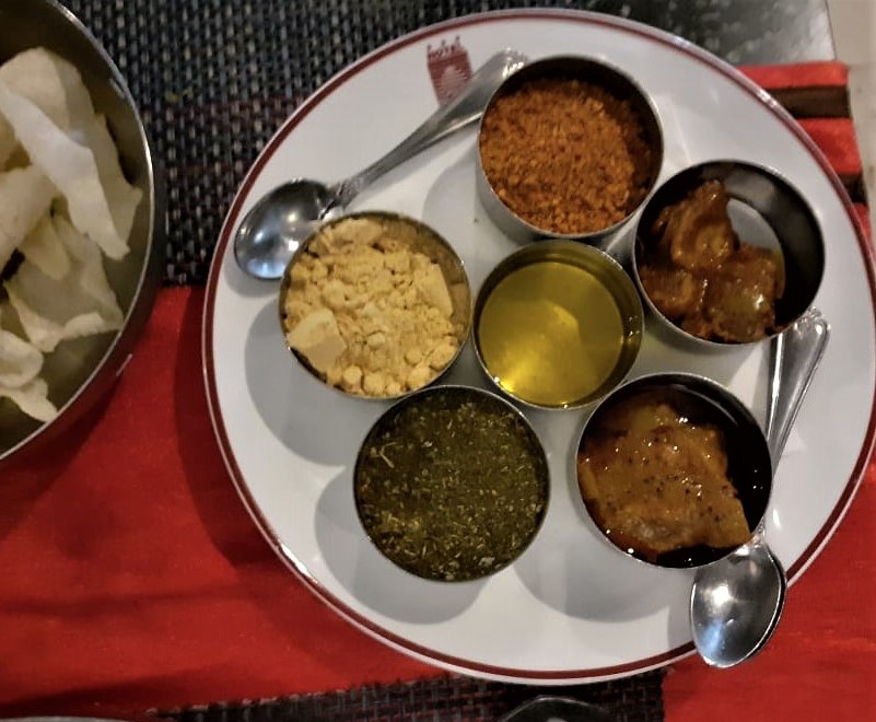 In general, no South Indian meal is considered complete without at least one (if not two) chutneys. Back in the day when I used to work in Bangalore, my favorite meal was a ‘thali’, at a restaurant called Nagarjuna Residency. An unlimited meal served on plantain leaf, with a variety of chutneys, veggies and dals, thali is total bang for the buck. I would get so full and sleepy after the meal, the thought of going back to was dreadful!  The thing I liked the most about this meal was the variety of fresh chutneys they would serve. Each time I had a thali here I would always get at least one chutney I hadn’t tried before.